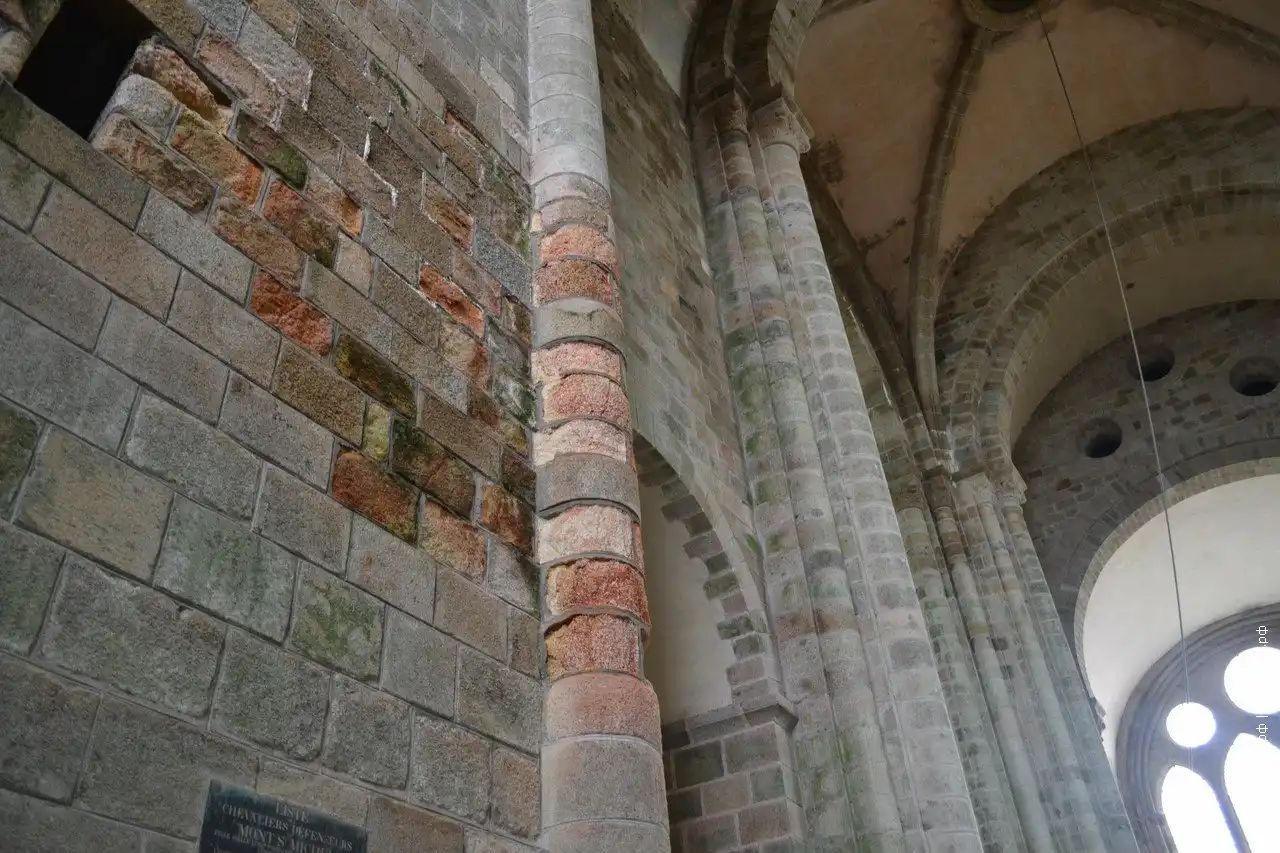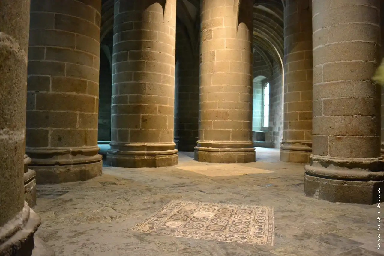 Бенедиктинцы мечтали, чтобы Мон-Сен-Мишель стал своеобразным гимном во славу Всевышнего. Однако расположить на вершине скалы огромное здание собора, которое могло бы вместить всех паломников, не представлялось возможным. Тогда было решено построить сначала четыре часовни, ориентированные по сторонам света, которые бы стали платформой для будущего здания. Так появились крипта Больших пилонов, обращенная на восток, на юге — крипта Сен-Мартен, на севере — крипта Нотр-Дам-де-Трент-Сьерж (Богоматери Тридцати Свечей), на западе — крипта Нотр-Дам-су-Терр (Богоматери Подземелья). Нотр-Дам-су-Терр — самая древняя, в ней обнаружены фрагменты церкви, построенной в дороманском стиле, возможно, первого святилища на горе. В 1023 году началось строительство собора в романском стиле, законченное только к 1520 году в готике.