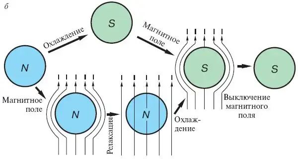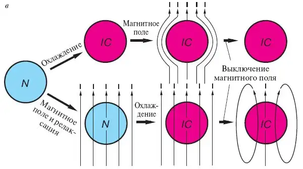 б — из нормального состояния при температуре выше Tc есть два пути: Первый: при понижении температуры образец переходит в сверхпроводящее состояние, затем можно наложить магнитное поле, которое выталкивается из образца. Второй: сначала наложить магнитное поле, которое проникнет в образец, а затем понизить температуру, тогда при переходе поле вытолкнется. Выключение магнитного поля дает ту же картинку;