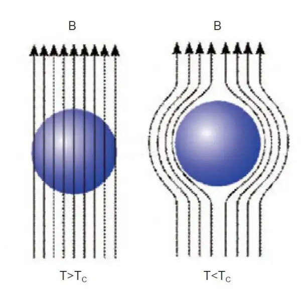 Проводник в сверхпроводящем состоянии, в отличие от идеального проводника, ведет себя как диамагнетик. Внешнее магнитное поле вытесняется из объема сверхпроводника. Тогда если поместить магнит над сверхпроводником, магнит зависает в воздухе.