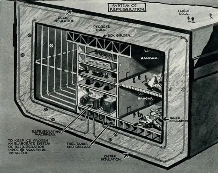 Таяние такого «корпуса» не стало бы проблемой в операции, которая могла занять считанные дни или недели, к тому же – немного замедлить его можно было с помощью мощных холодильных установок. Чуть позднее идея трансформировалась. Британский инженер и учёный Джеффри Пайк (Geoffrey Pyke), сотрудник ведомства Маунтбаттена, предложил собирать боевые корабли из замороженных ледяных блоков, встраивая в конструкцию трубы холодильных установок.