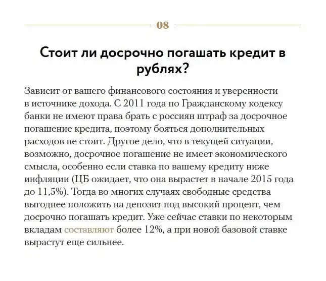 Для усиления действенности процентной политики кредиты обеспеченные поручительствами или нерыночными активами, взятые на срок от 2 до 549 дней предоставляются не по фиксированной процентной ставке, а по плавающей, которую установят на уровне ключевой ставки Банка России, но увеличенной на 1,75 процентного пункта. Следующий раз ключевую ставку рассмотрят уже в начале 2015-го года.