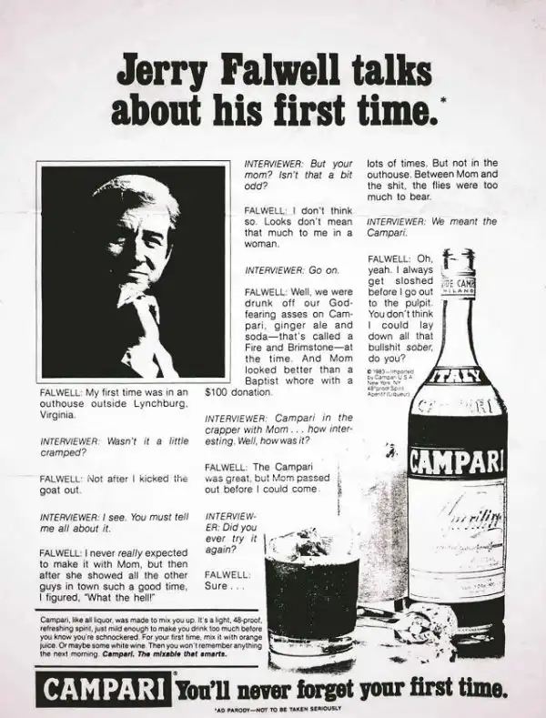 В одном из номеров "Hustler" было опубликовано псевдоинтервью с проповедником и главным идейным врагом Флинта – Джерри Фолуэллом, которое было оформлено в виде пародии на рекламу "Кампари": в оригинале брался какой-либо известный персонаж, который рассказывал о вкусовых качествах напитка. Заголовок рекламного текста звучал всегда одинаково: "(Имя) рассказывает, как он попробовал в первый раз." Флинт не смог пройти мимо подобной двусмысленности и написал о том, как проповедник рассказывает о якобы своих сексуальных отношениях с собственной матерью. Проповедник подал в суд, а прокурор, ведущий дело, кричал о том, что Флинт хочет превратить Америку в планету обезьян. В конце концов, Фалуэлл получил $100 000 в качестве возмещения ущерба, но это решение было отменено в 1988 году, сделав Флинта победителем. В 1997 году Флинт и Фалуэлл появились на шоу Ларри Кинга, где предавались ностальгии о тех временах. Говорят, что они обменивались рождественскими открытками до самой смерти Фалуэлла.