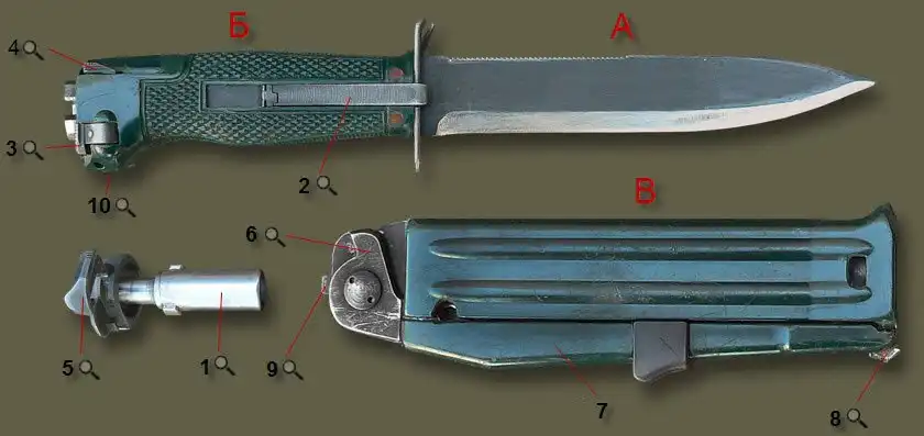 Устройство ножа НРС-2: А. Клинок с пилой и гардом, Б. Стреляющее устройство : 1. Ствол; 2. Рычаг взвода; 3. Спусковой рычаг; 4. Предохранитель; 5. Замыкатель; 10. Мушка; В. Ножны : 6. Кусачки; 7. Рычаг; 8. Защелка; 9. Отвертка.