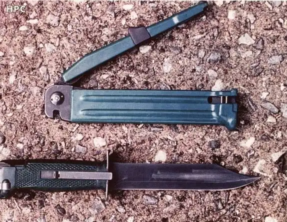 Нож разведчика стреляющий НРС-2 и его ножны с отведенным рычагом.