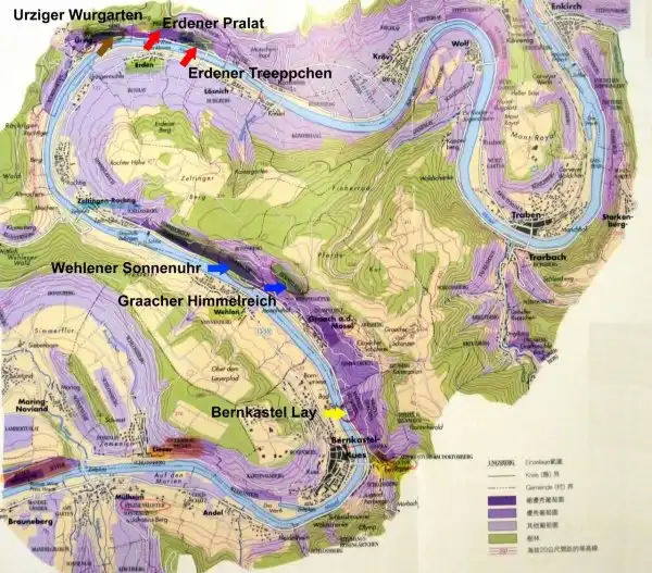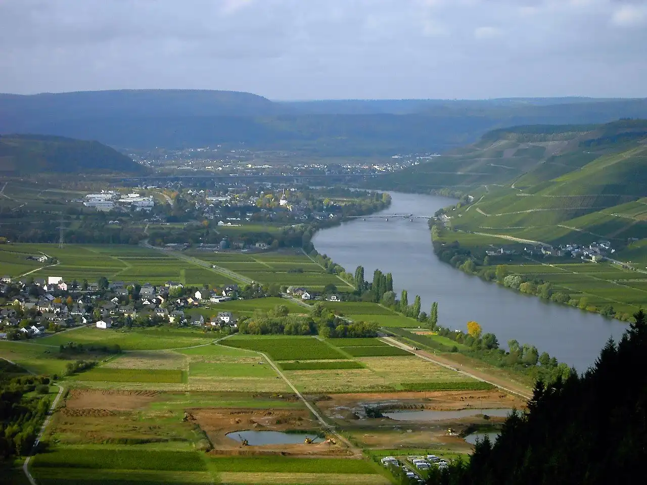 Всего 65 км в среднем течении извилистого Мозеля (Mosel) занимают заложенные еще римлянами виноградники, где делают лучшие вина региона. Впечатляющие сланцевые берега реки, местами достигающие 200 м в высоту, создают отличные условия для Riesling. Сорт, который здесь начали высаживать уже в XV в, окончательно отвоевал лучшие участки в XVIII в.