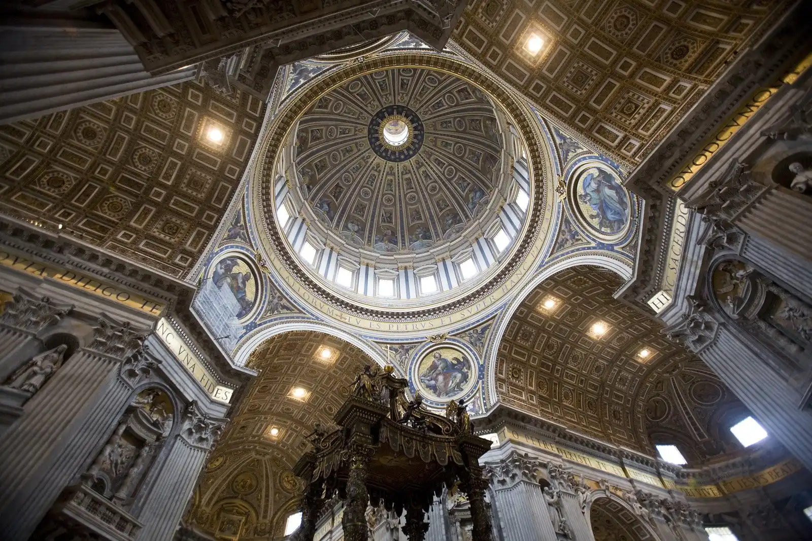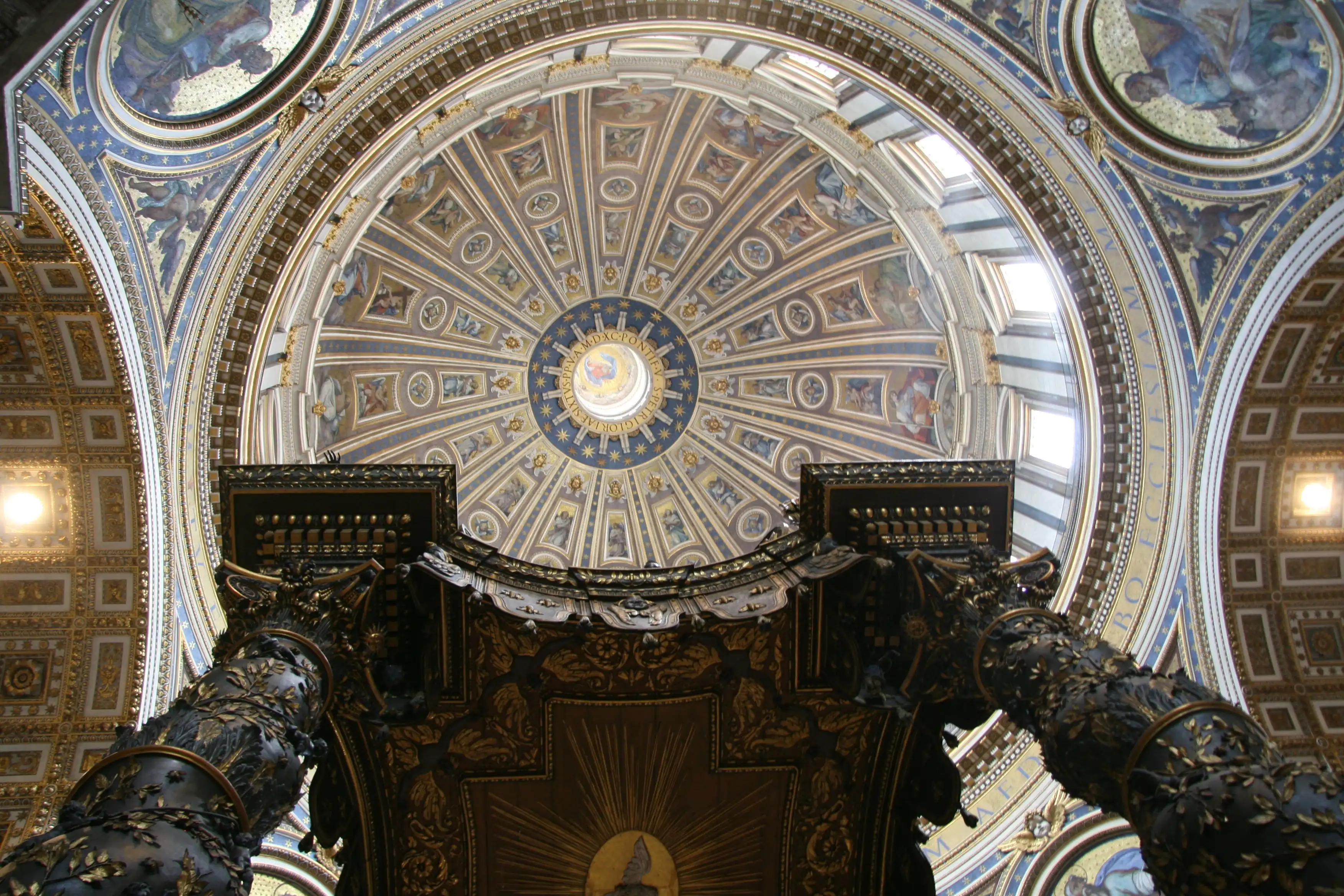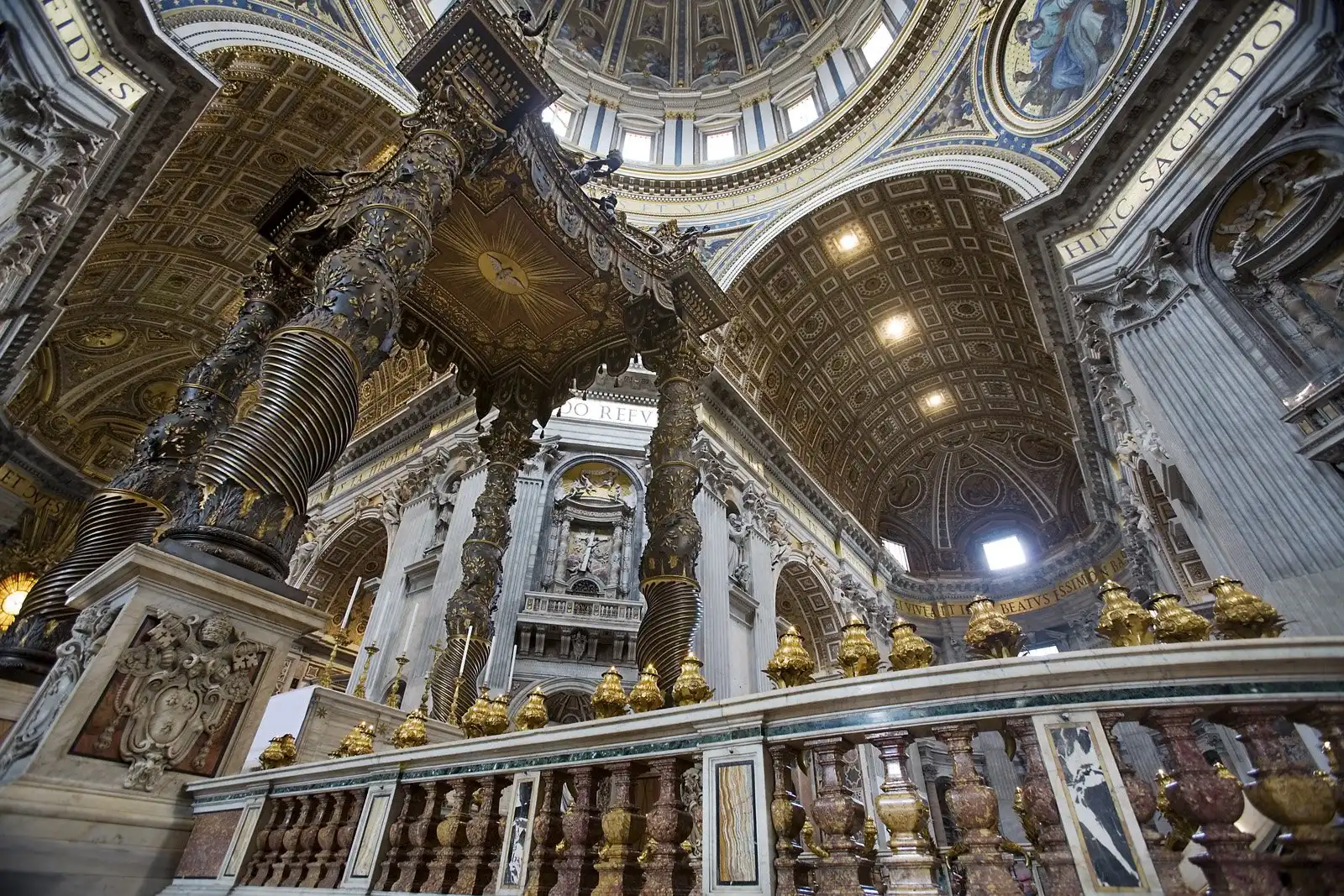 Купол, шедевр архитектуры, имеет внутри высоту 119 м и диаметр 42 м. Он опирается на четыре мощных столба. В нише одного из них стоит пятиметровая статуя св. Лонгина работы Бернини. Роль Бернини в создании скульптурного убранства собора очень велика, он работал здесь с перерывами почти пятьдесят лет, с 1620-го до 1670 г. В подкупольном пространстве над главным алтарём находится шедевр Бернини — огромный, высотой 29 м балдахин (киворий) на четырёх витых колоннах, на которых стоят статуи ангелов. Среди ветвей лавра на верхних частях колонн видны геральдические пчелы семейства Барберини.