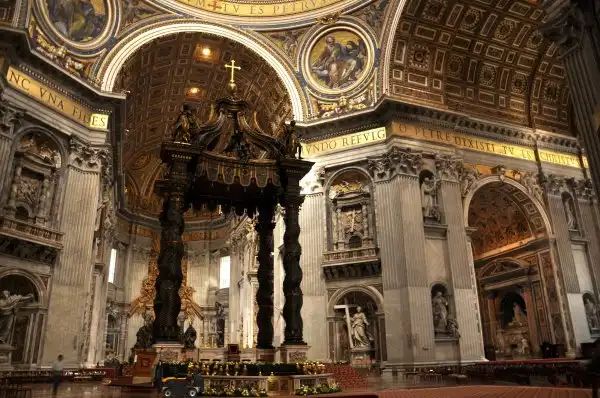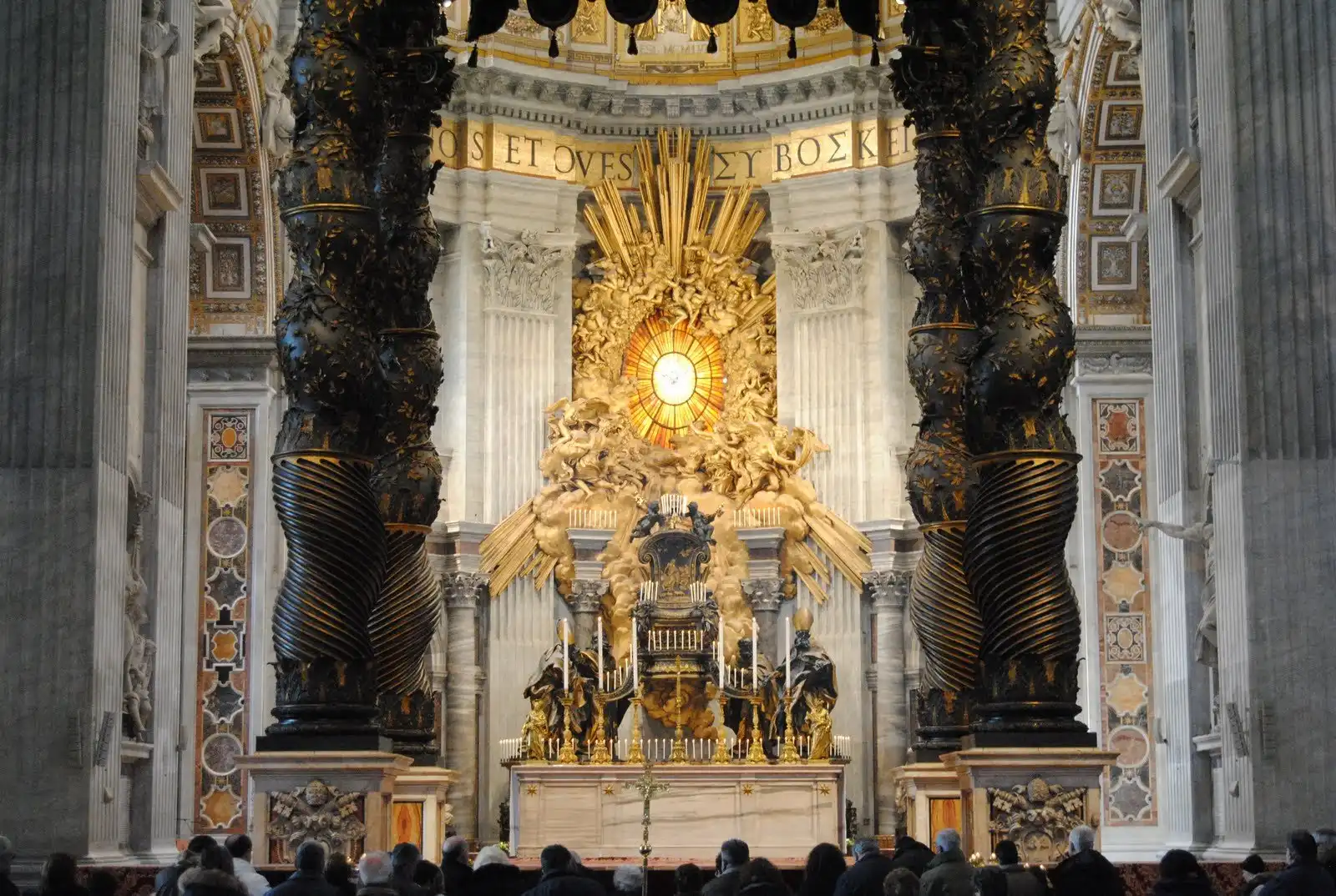 Бронзу для кивория взяли из Пантеона, разобрав по приказу папы Урбана VIII (Барберини) конструкции, которые поддерживали крышу портика. Сквозь балдахин видна находящаяся в центральной апсиде и также созданная Бернини кафедра св. Петра. Она включает поддерживаемое четырьмя статуями отцов церкви кресло св. Петра, над которым парит в сиянии символ Святого Духа. Справа от кафедры — надгробие папы Урбана VIII работы Бернини, слева — надгробие Павла III (XVI в.) работы Гульельмо делла Порта, одного из учеников Микеланджело.