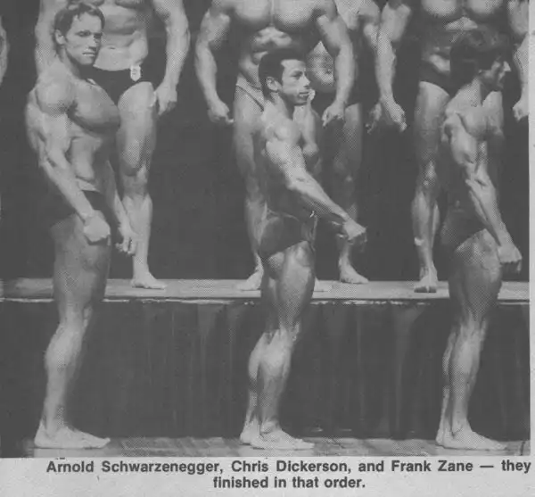 Царствующий Мистер Олимпия Фрэнк Зейн, который выигрывал на конкурсе последние 3 года, когда его проведением занимались Арнольд и Лоример в Колмабусе, штат Огайо, сомневался в возможности защитить свой титул. После очень продуктивных тренировок в межсезонье Зейн выглядел действительно хорошо, но, начав непосредственную подготовку к соревнованиям, получил очень серьезную травму. Когда он загорал рядом с бассейном, стул, на котором он сидел, сломался. Зейн ударился пахом об ребро бассейна, что вызвало значительное внутреннее кровотечение. После выписки из больницы Фрэнк сильно потерял в объеме мышц и не знал, стоит ли ему выступать. На трех предыдущих, победных для него Олимпиях Зейн значительно улучшался год от года, и судьи награждали его, принимая во внимание этот прогресс.