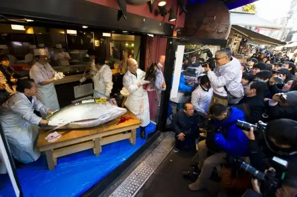В Японии прошли традиционные торги, где продавался самый крупный выловленный голубой тунец. В этом году крупнейший представитель этого вида весил 180 килограмм, а его покупателем в очередной раз стал владелец сети ресторанов суши «Kiyomura».