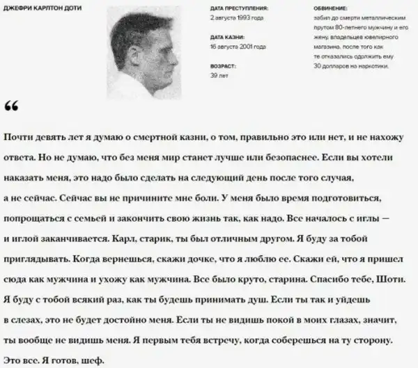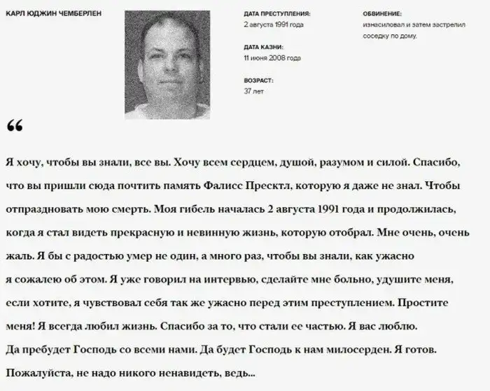 В США, приговоренные к смертной казне осужденные, нередко перед исполнением приговора проводят долгие годы в тюрьме. За это время большинство из них осознает свою вину, а потому их последними словами становятся слова прощения. Также они вспоминают о своей семье и своих жертвах.