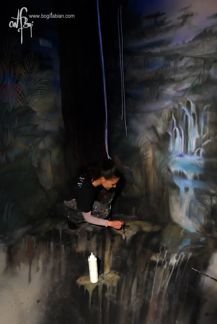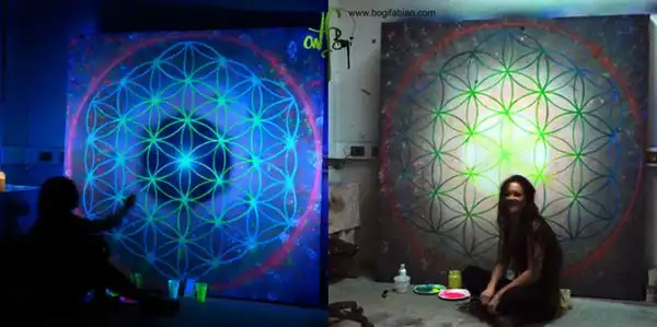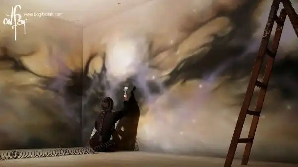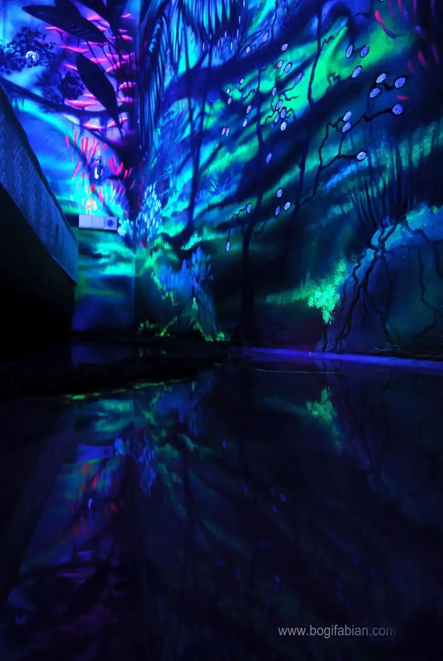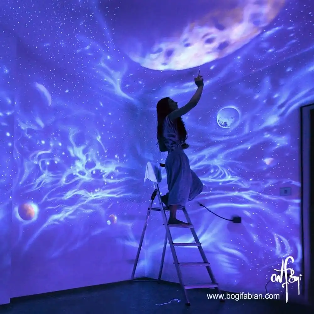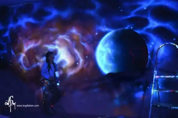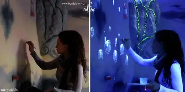 Художница венгерского происхождения Боги Фабиан (Bogi Fabian) создает потрясающие настенные рисунки, которые можно увидеть только в кромешной тьме. Свои работы Боги Фабиан может изобразить тремя способами: обычные «дневные» рисунки; росписи, которые можно увидеть только при помощи УФ-лучей и изображения, нанесенные фосфоресцирующими красками. Таким образом, после выключения света зрители вдруг оказываются в окружении светящихся звезд и космических облаков.