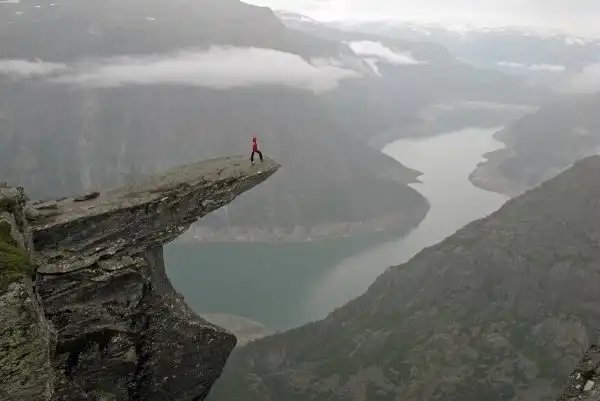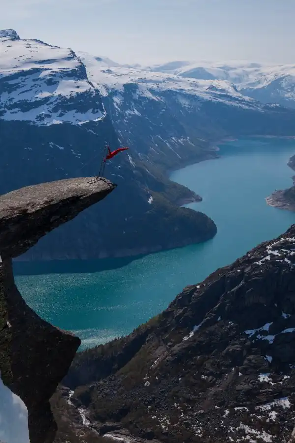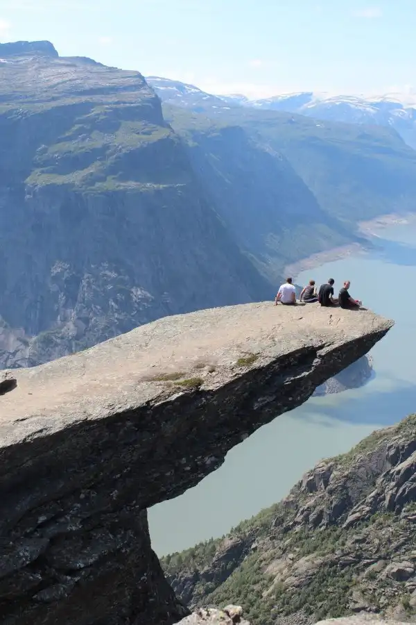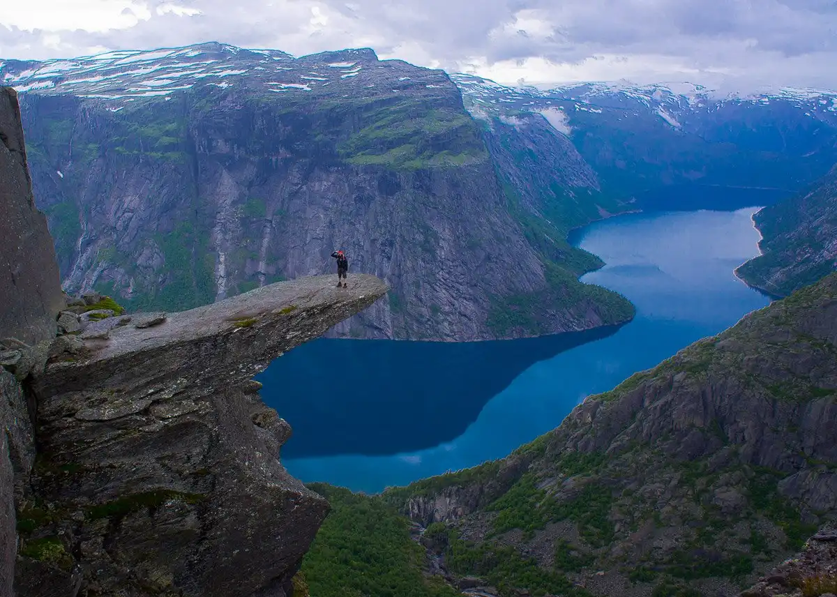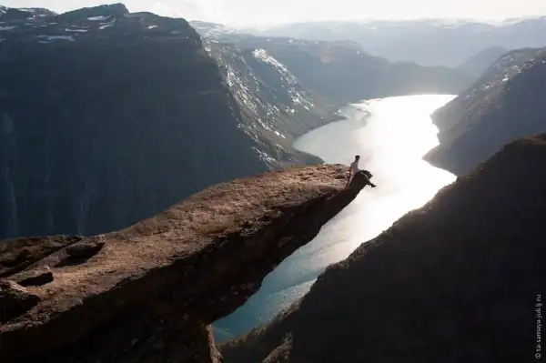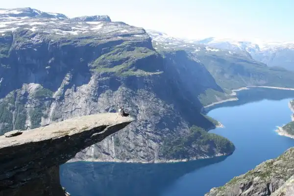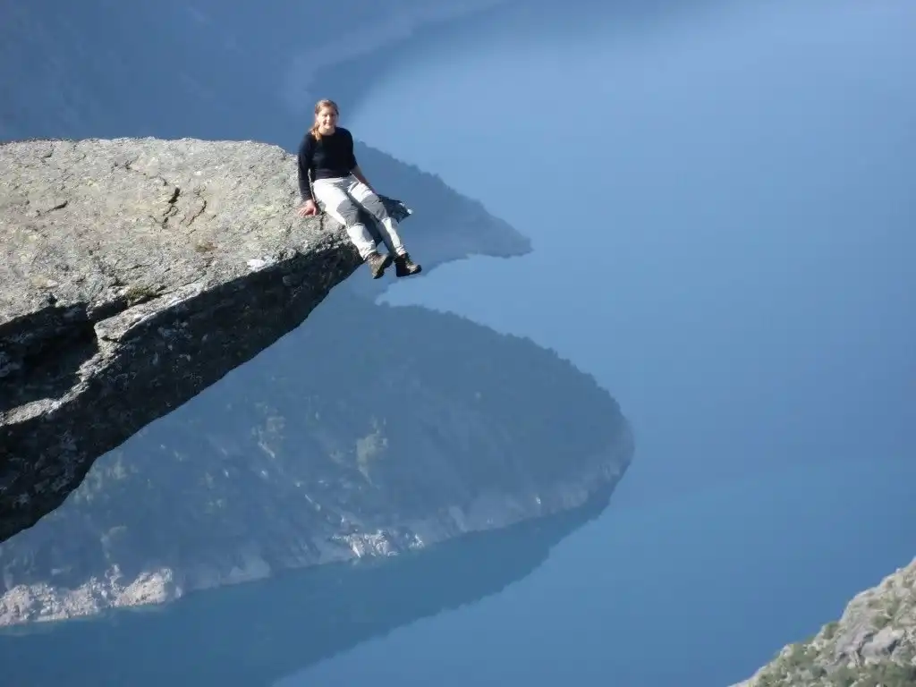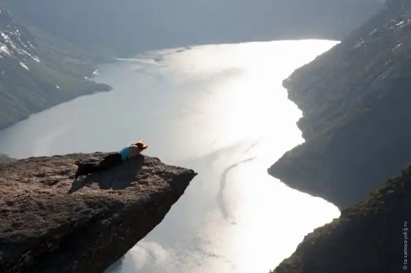Троллтунга – каменный выступ по своей форме очень напоминающий острый язык. Когда-то давно это каменное творение отклонилось от основания скалы, и, отколовшись, неподвижно остановилось на высоте 800 метров над озером.