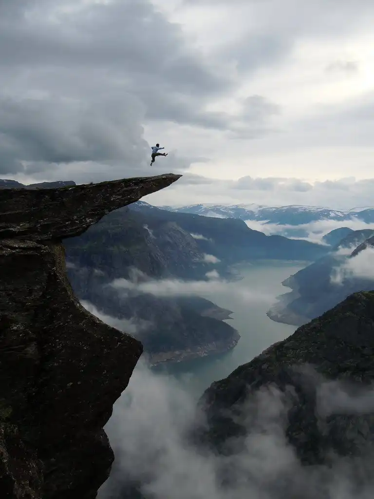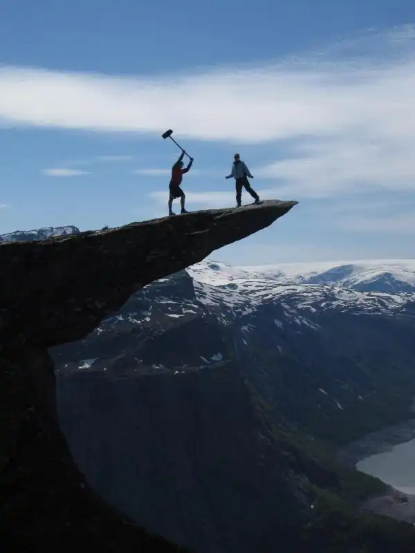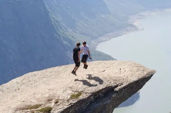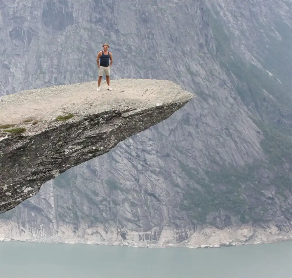 Некоторые смельчаки поднимаются на Язык Тролля и даже доходят до его конца, не боясь что она обрушится. Это вызов судьбе, а может просто удача очередного человека, который вступает на скалу, что она не обрушится именно сейчас! А ведь когда нибудь рухнет !