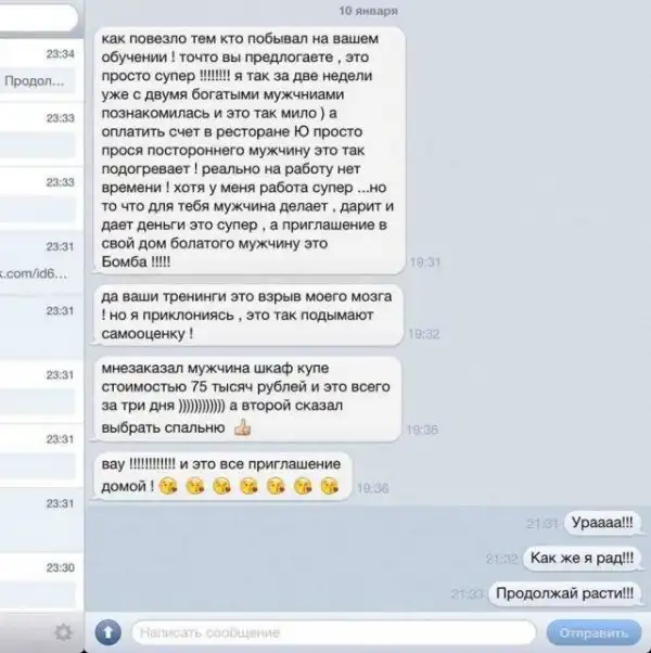 В настоящее время в сети можно натолкнуться на множество тренингов для женщин, один из таких тренингов «учит» дам тому, как выйти замуж за достойного мужчину. Идея данного тренинга проста – вы находите состоятельного мужчину и исполняете все его прихоти. Особое внимание в тренинге отводится теме секса, впрочем, обо всем этом расскажет видеоролик, на котором сам автор тренинга учит девушек, как правильно вести себя с мужчиной.