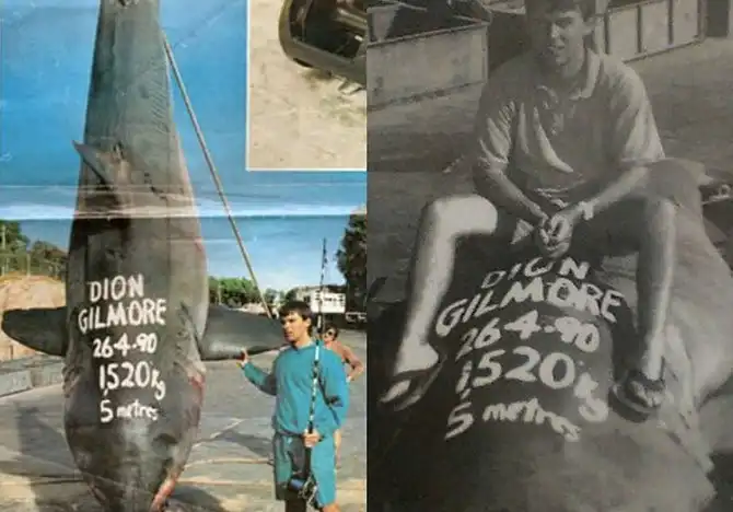 Лавры славы охотника за акулами в 1992 году достались Диону Гилмору. У берегов Южной Австралии он вытащил из океана акулу весом 1520 кг. и длиной 5,2 метра.