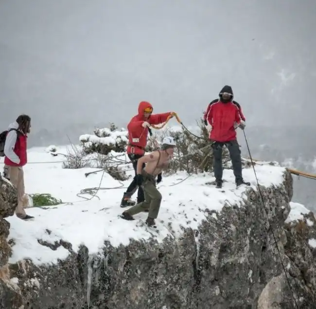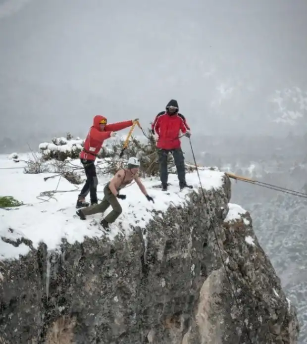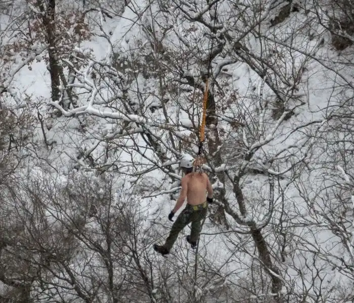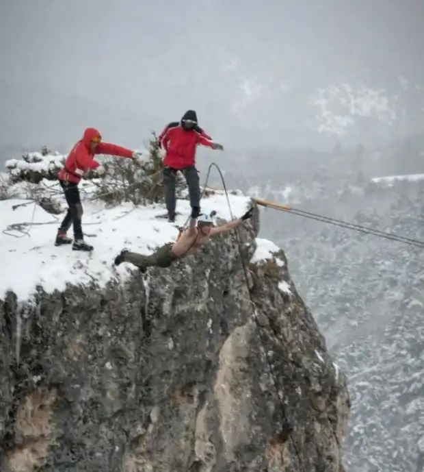 Российский экстремал Евгений Иванов из города Набережные Челны совершил первый в мире прыжок с 62-метровой высоты, подвесив себя за кожу спины. Вместо обычного снаряжения, которым пользуются роуджамперы, кожу парня проткнули четырьмя металлическими кольцами, за которые и привязали веревку.