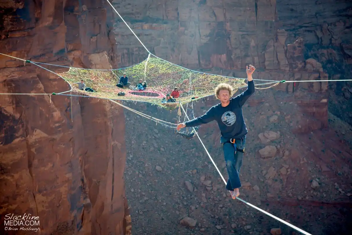 Они должны были пройти 120 метров по натянутому канату, расслабиться перед базовым прыжком, насладиться прекрасными видами и сделать фотографии. В итоге, они по очереди ныряли с парашютом в каньон через отверстие этой сетки. Moab Monkeys — специалисты по слэклайну, хайлайнингу, бейсджампингу и кинопроизводству. Они выполняли свои трюки во многих местах, включая Рио и австрийские Альпы.