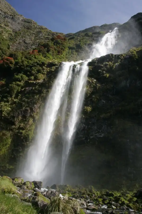 Водопад Сазерленд представляет собой фантастическое, захватывающее дух творение природы. Он срывается с горных вершин Южных Альп с мощным ревом, который слышен на большом расстоянии. Мощь водопада впечатляет, искрящиеся струи воды обрушиваются вниз с огромной силой и разбиваются в облаке брызг. Гремящий рев воды и ослепительные радуги, искрящиеся вокруг водопада, создают неповторимое сказочное зрелище.
