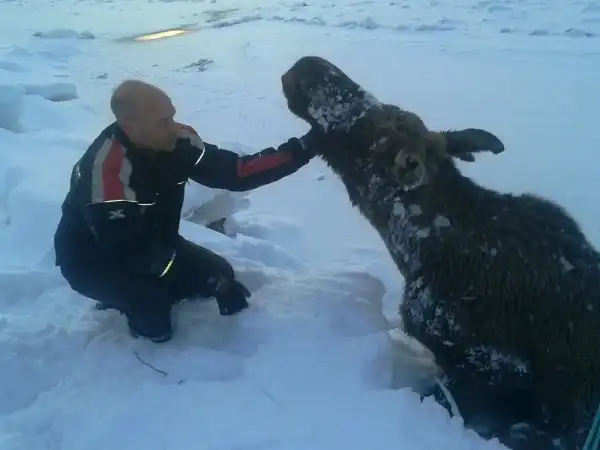 Возвращался я на днях из рейса в норвежское Заполярье. Поездка выдалась, надо сказать, откровенно аццкая. Всю дорогу наверх, температура постоянно скакала от +3 до -6. И метель, с очень небольшими перерывами. Мокрого снега на дорогу нашвыряет, его укатают по-быстрому и он тут же льдом схватывается, чтобы вскоре сверху водичкой талой покрыться. А у меня ещё и груза – 4 тонны по всей телеге «размазано». То есть, ведущую ось к дороге никак не прижимает, а хвостик назад тянет. И вот, как ещё ниже Трондхейма этот ледовый ад начался, так на тыщщу вёрст, до самого финиша. Четыре раза на подъёмах раскорячивался, три цепи порвал, крылья на задних осях в такую труху размолотило, что посрывал да выкинул… Кароч, кошмарный сон дальнобойщика, а не рейс!.. Зато, на обратную дорогу кидают мне 23 тонны груза! Песня! Машина дорогу держит, на горки оленем вспрыгивает! Опять же, норги уже очухались – где насечек на льду нарубили, где крошкой гранитной посыпали, а где коммуна позажиточней – даже, «антильдом» по подъёмам прошлись. Это ж, после того «сталинграда», почти прогулка а не рейс! Ну вот, качусь. Сижу в футболочке, на приборке кружка с горячим кофе, музычка хорошая. А, норвежские дороги, хоть и трудные, но и по красоте – ни с чем не сравнить. Слева скалы живописнейшие, справа – речка горная. Самые трудные участки уже позади, поэтому нет-нет, по сторонам глазею.… И тут, глазом цепляюсь за какой-то очень странный камень на реке. А только рассветать начало – сразу и не разобрать. И, как раз, деревья справа кончаются и вижу, точно – лось в полынье. А сам, ещё из школьного курса «природоведенья» помню, что не увлекаются лоси моржеванием! Стало быть, угорел лопоухий, в самый что ни на есть блудняк! А там, терраска такая над водой каменистая, что его из маленьких машин и не видно. Это я вот, сижу высоко – разглядел. Остановил машину на «аварийках», останавливаю встречную. Объяснил норгу ситуацию, дескать, ты позвони, куда тут у вас звонят в таких случаях?.. Тот чего-то куда-то набрал, поговорил на тамошнем языке, говорит – сейчас очень скоро будут! Ну, думаю – дождусь, чтоб они место по моей машине сразу нашли. Схожу пока, поддержу зверушку морально, ну и так – гляну, чего там что. Опять же, интересно глянуть, что там за команда приедет?.. Я ж, передачи всякие про МЧС видал! Плотики там плавающие, бравые парни в теплых гидрокостюмах… А то и, вертолёт пришлют – заведут под лося стропы да и поставят аккуратненько на берег?.. А, что?.. Летом, вон, под меня встречный дедушка залетел – его же покатали на вертолёте!.. В общем, спускаюсь к реке. Сохатый, смотрю, уже совсем никакой. Видать, с глубокой ночи уже купается. Фарватер во льду прорубил метров наверное двести. Но, всё какими-то петлями. Видать, не столько к берегу пёр, сколько пытался на лёд забраться. Видно, что обессилел совсем. Но, башку пока держит, взгляд осмысленный и, что самое главное, дрожит! То есть, критического переохлаждения ещё не случилось. Значит, его только на берег вытащить, а реанимировать не придётся! Ну, слов каких-то ободряющих ему наговорил. Лось, вроде, как-то даже и реагирует. Вроде, даже как-то и в мою сторону телом податься пытается. Сам прикидываю, чего тут вообще сделать можно, если без вертолёта придётся доставать. У берега лёд течением быстрым подмыт – вообще никакого веса не держит. Что дальше – не понятно. Тут, либо д