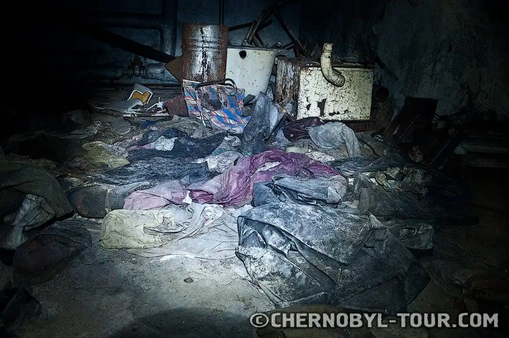 Внутри нескольких других — свалена та самая одежда пожарных и персонала станции. Уже на входе в комнату дозиметр показывает