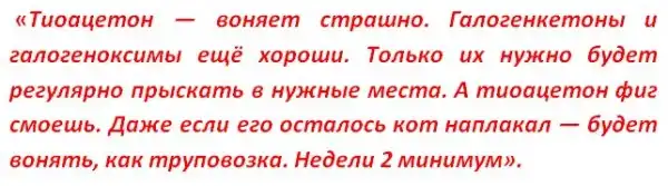 Тиоацетон сразу же после получения самопроизвольно полимеризуется в ТРИтиоацетон — вещество, лишенное всякого запаха. Но стоит тритиоацетон деполимеризовать обратно до мономера… и начинается незабываемый праздник.