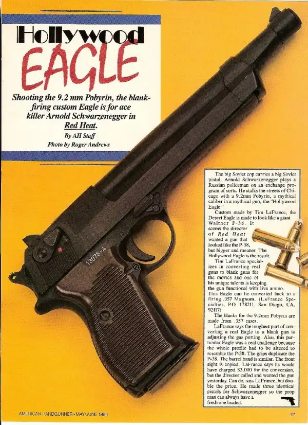 На самом деле всё было немножко не так. Или даже, совсем не так . Для Глав. героя фильма , в исполнении Арнольда Шварценеггера , режисcёр Уолтер Хилл ( Walter Hill ) захотел "Walther P38, но - больше и злее. P38 на стероидах" , по его собственному выражению. В итоге , оружейник Тим Ляфранс ( Tim LaFrance ) построил три экземпляра пистолета , которые он назвал "Голливудским Орлом"/"The Hollywood Eagle". Он использовал пистолет Desert Eagle 0,357 Mk I в качестве основы , и сделал всё , чтобы сделать его похожим на большой Walther P38 . По словам Тима , самая трудная часть преобразования заключалась в переделке системы газоотвода ( пистолет должен был реально стрелять ).