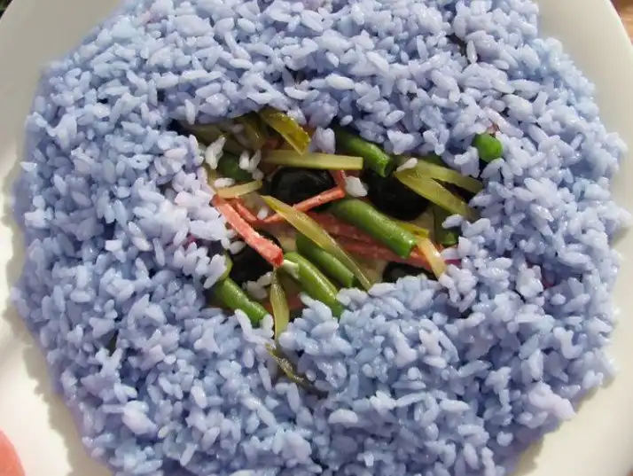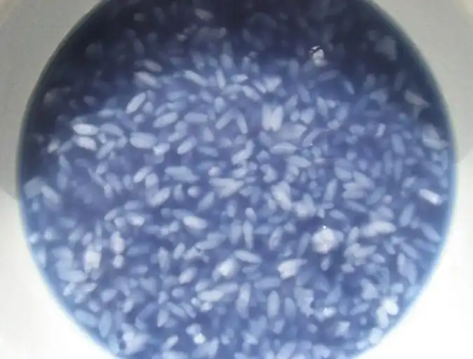 Для этого один листик краснокачанной капусты режем, заливаем стаканом воды и варим 5 минут. Вода становится синей. Этой водой заливаем рис и настаиваем минут 5.