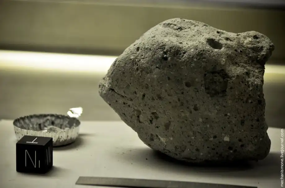 6. Камень слева взят с Луны во время экспедиции Аполлон 15. Пишут, что этот камень был сформирован 4 млрд. лет назад при ударе метеорита, при высокой температуре и давлении. Камень содержит большое количество минералов. Черный кубик рядом с породой указывает на минералы, которые входят в состав породы.