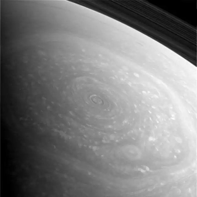 На Южном полюсе Сатурна никаких шестиугольников нет — зато там есть огромная воронка в атмосфере. В центре шестиугольника на Северном полюсе тоже есть такая воронка. Впервые этот феномен обнаружили космические аппараты проекта «Вояджер» в начале 1980-х годов. Когда в 2006 году к Сатурну подлетел аппарат «Кассини», он снял на видео вращение шестиугольника.