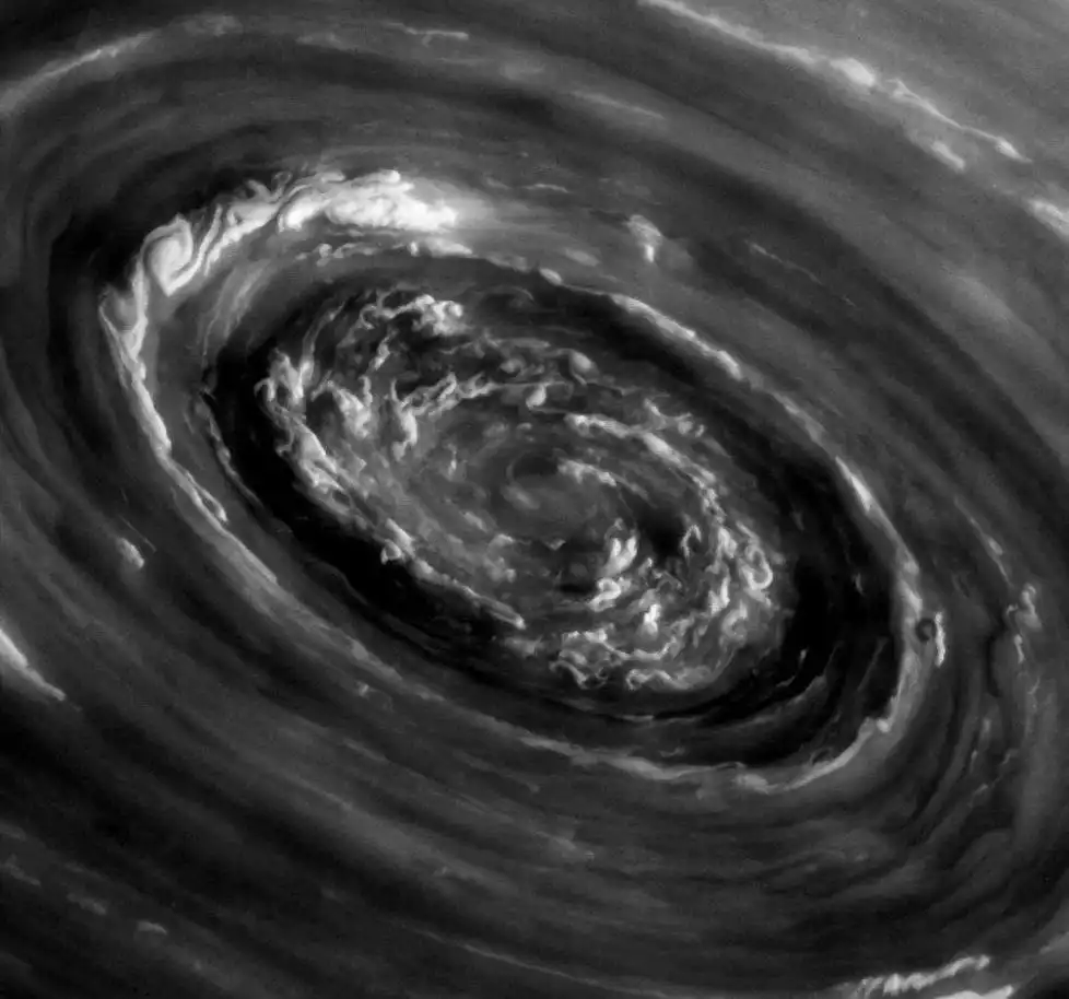 Фотография выше была сделана 27 ноября 2012 года с расстояния 376 171 км. за северным полюсом Сатурна с помощью орбитального аппарата Кассини, принадлежащего НАСА. На фото запечатлено очень интересное атмосферное явление, которое ранее нигде не встречалось.