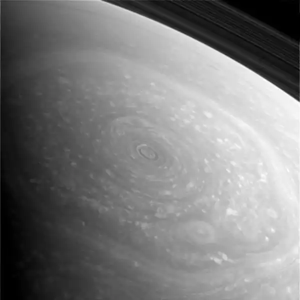Это было первое изображение, содержащее в одном кадре всю фигуру и область, прилегающую к северному полюсу Сатурна.