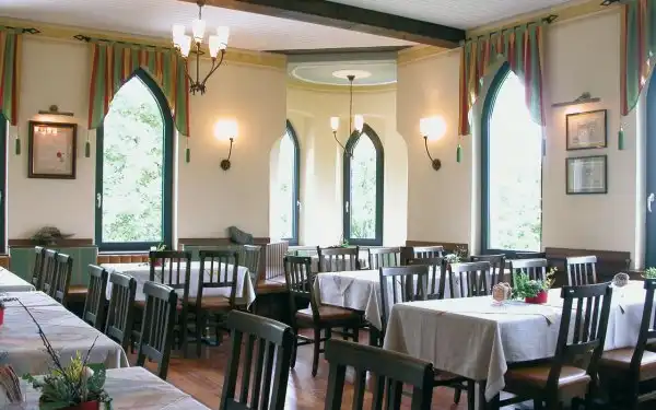Результатом его усилий явился замок в неоготическом стиле, причем стены до второго этажа сохранились от старой крепости. За небольшим мостиком, служащим входом, вырастает замок, состоящий из множества компонентов: за воротами, украшенными башенками и зубцами, встает сначала двухэтажный, потом трехэтажный дворец со стрельчатыми окнами, уступчатыми щипцами и эркерами. За ними возвышается стройный донжон, увенчанный зубчатой короной.
