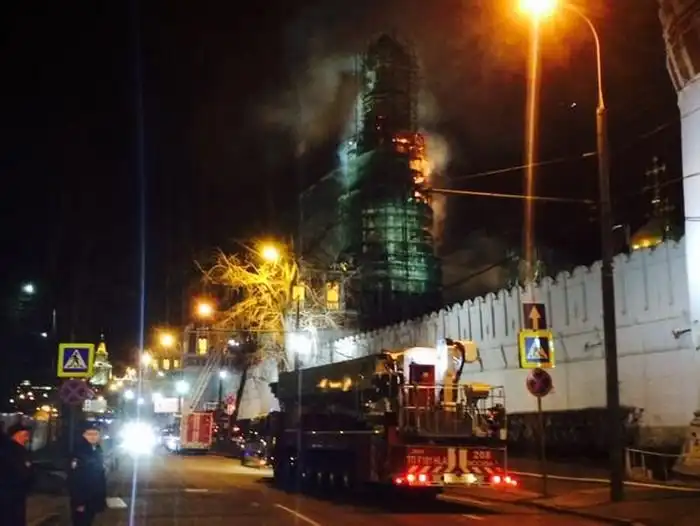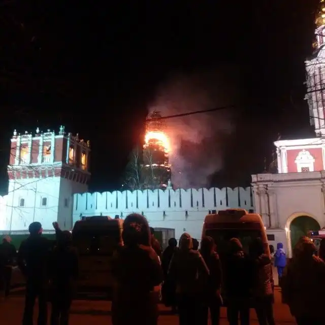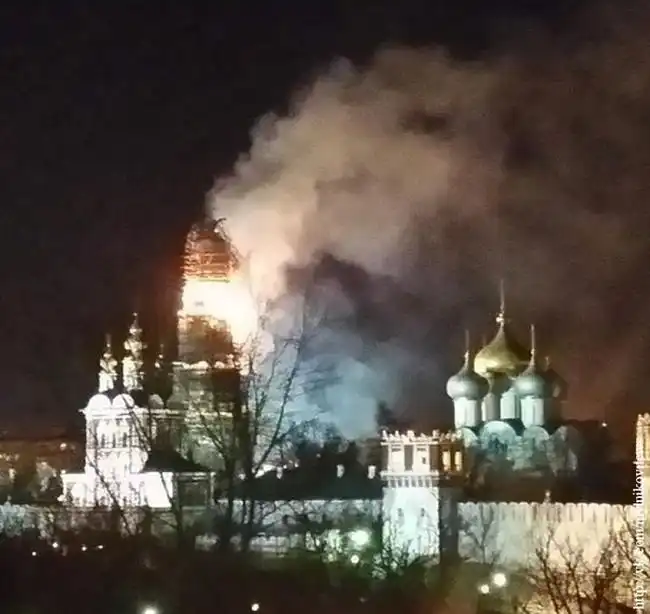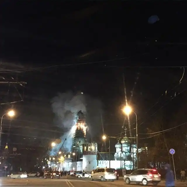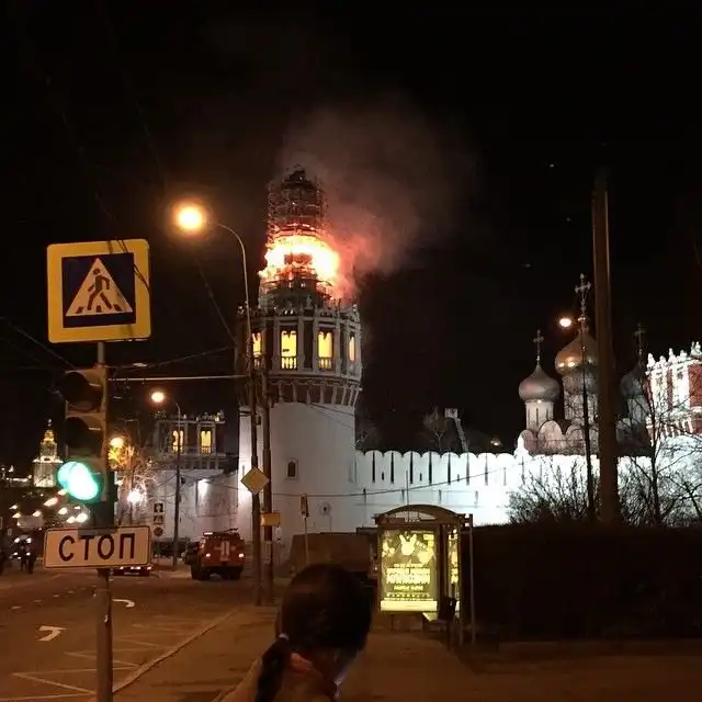 На территории московского Новодевичьего монастыря загорелась колокольня. Пожар начался сегодня вечером, первые пожарные машины прибыли на место спустя четыре минуты после поступления сигнала. Колокольня находилась на реконструкции, и загорелись строительные леса, которые позже обрушились. Пожару присвоили вторую повышенную степень, а его площадь составляет около 100 квадратных метров.