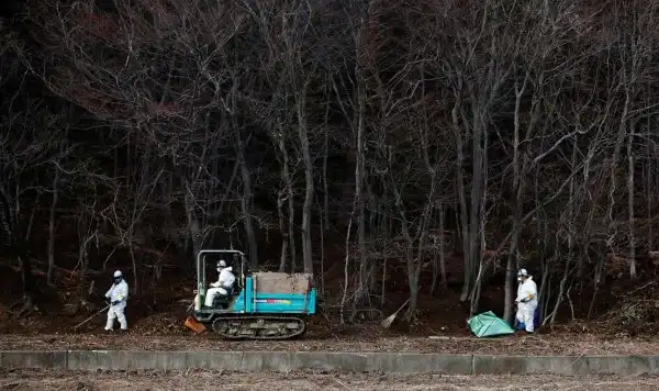 Работники в защитных комбинезонах и масках собирают радиоактивную землю и листья в небольшом городке Томиока, что неподалеку от электростанции в Фукусиме. 24 февраля 2015 года.