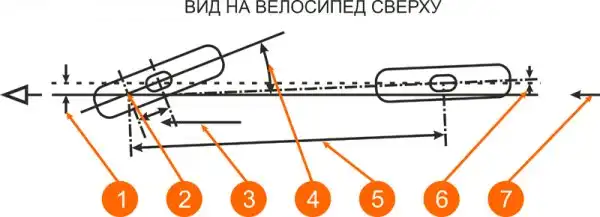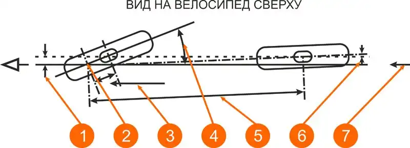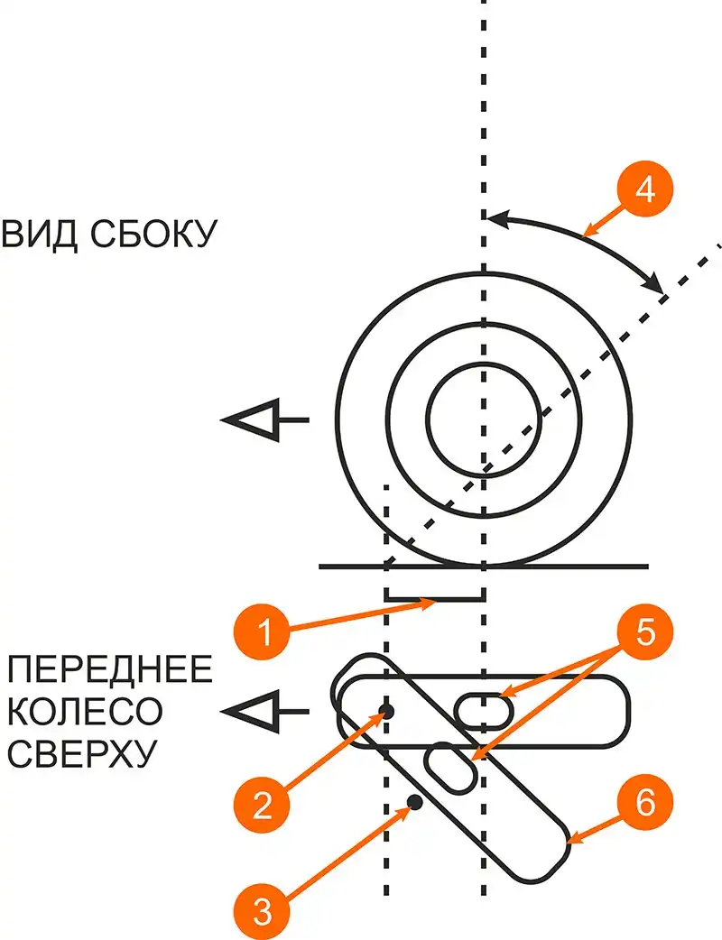 1. Вылет, 2. Ось рулевой колонки на уровне земли,