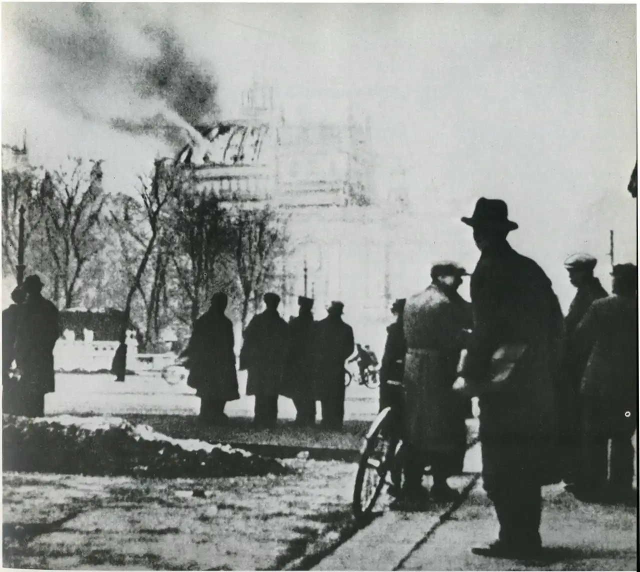 …Вечером 27 февраля 1933 года здание охватил шквал огня. Он распространялся с поразительной быстротой, привлекая внимание сотен людей. Место пожара в скором времени посетили вождь национал-социалистов Адольф Гитлер и главный «пропагандист» наци Йозеф Геббельс, а немного позже появился Герман Геринг, в то время председатель рейхстага и политуполномоченный Гитлера, заявивший, что виновниками пожара являются коммунисты. Первым был арестован подданный Нидерландов Маринус ван дер Люббе, несколько лет тому назад состоявший в компартии. Говорили, что он производил впечатление не вполне нормального человека, сдался без всякого сопротивления и вины своей не отрицал.
