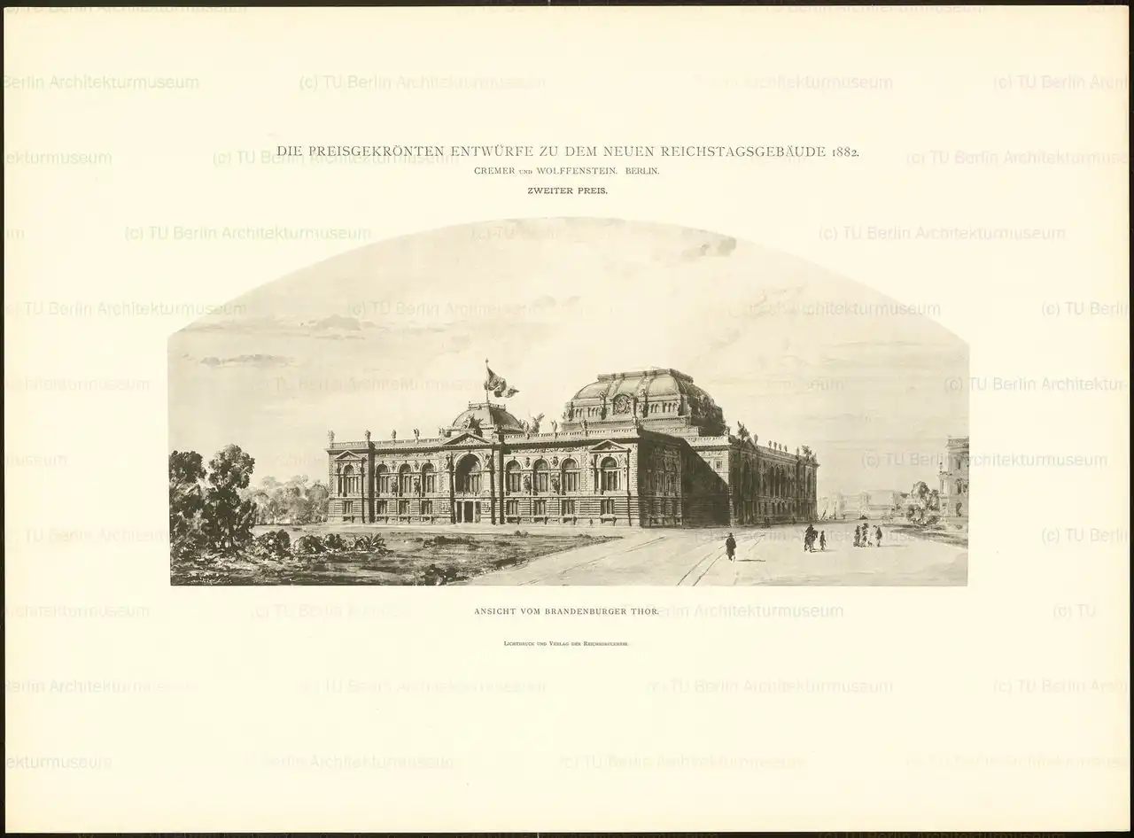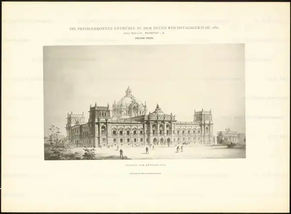 В том же году Бисмарк принял решение о возведении нового здания парламента. Место для строительства было выбрано специально созданной комиссией, постановившей, что быть ему надлежит на территории владений крупного дипломата Дюка Радзинского. Через год был объявлен конкурс на проект здания, в котором приняли участие 103 европейских архитектора. Победителем стал уроженец Санкт-Петербурга, профессор Академии художеств, покинувший Россию в 1861 году и поселившийся в городе Готе, Людвиг Бонштедт. Но строительство было отложено на неопределенное время в связи с тем, что господин Радзинский ни за что не хотел расставаться со своей собственностью, дарованной ему Фридрихом Вильгельмом IV. И даже после смерти несговорчивого дипломата в 1874 году его сын, унаследовавший земли отца, все так же продолжал упорствовать.