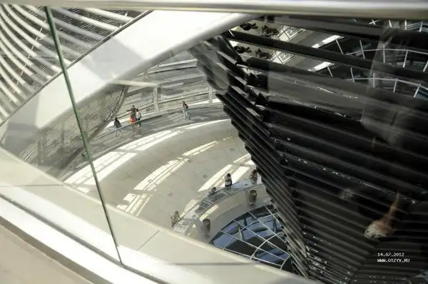 Изюминка фостеровского проекта — огромный зеркальный конус, начинающийся в вестибюле пола 1-го этажа и заканчивающийся у основания внутренней полости купола, представляет собой воронкообразную конструкцию диаметром 2,5 м у основания и 16 м — у потолка. Ее вес составляет 300 тонн, для облицовки были использованы 360 зеркал, причем с тем расчетом, чтобы зеркальная поверхность пропускала солнечный свет в зал заседаний только в часы отсутствия в нем парламентариев. Особые фильтры, вмонтированные в полость конуса, должны были способствовать приглушению отраженного от множества зеркал дневного света.