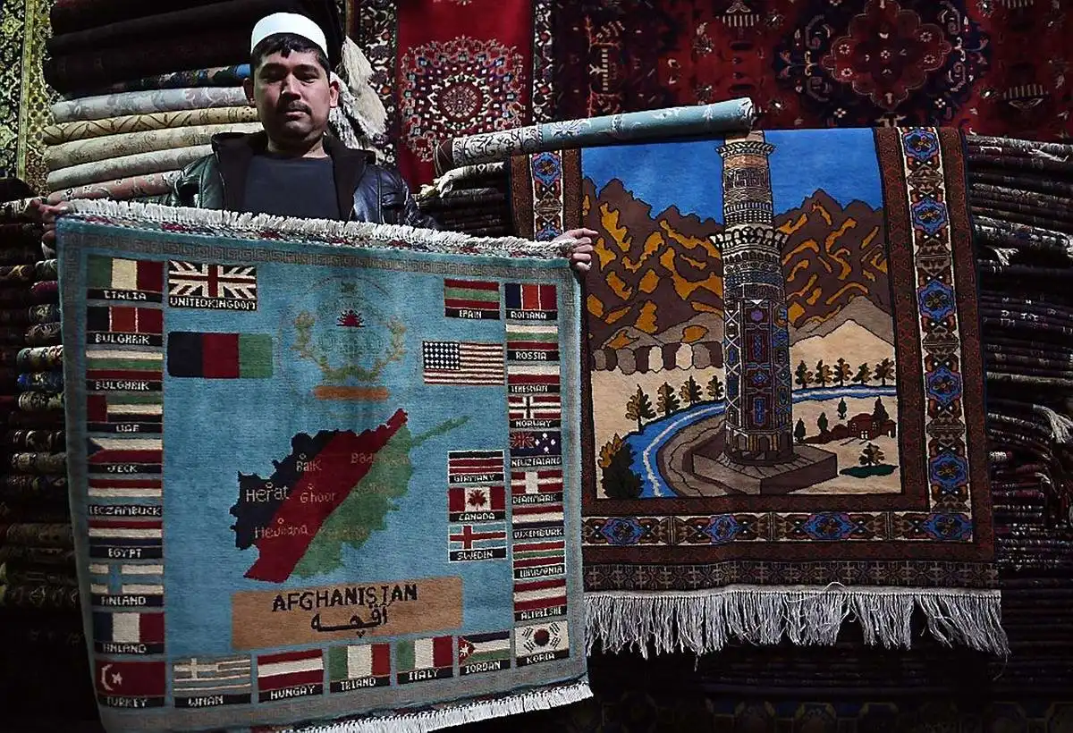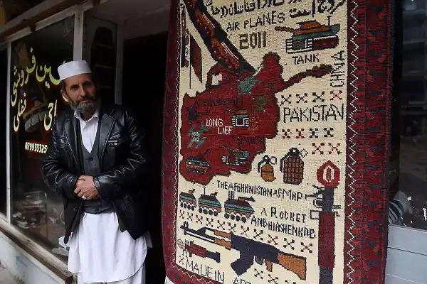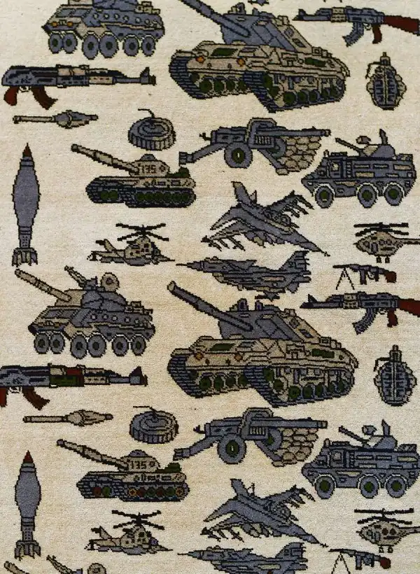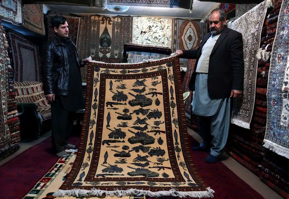 Более чем тридцатилетний период войны на территории Афганистана обернулся нанесением значительного ущерба некогда процветающий ковровой промышленности этой страны, но современные афганские ткачи на волне памяти о недавнем кровавом прошлом успели освоить производство ковров военной тематики, на которых они - вместо традиционного для себя мира цветов и животных - принимаются изображать пушки, танки, боевые самолеты и вертолеты, а также другие виды оружия. На одной из улиц Кабула, известной своими магазинами для иностранных туристов, как раз и выставляются на продажу такие ковры, которые выглядят, как страницы истории этой истерзанной войной страны.