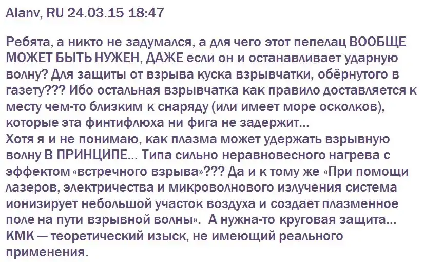 Такой «щит» теоретически убережет от самых мощных колебаний воздуха, но не от пуль или осколков разорвавшегося рядом снаряда. Не получится и постоянно удерживать вокруг объекта защитный «кокон». Дело в том, что во время работы системы происходит сильный нагрев воздуха. Помимо прочего, силовое поле еще и отражает свет, лишая обзора всех, кто находится внутри плазменного укрытия.