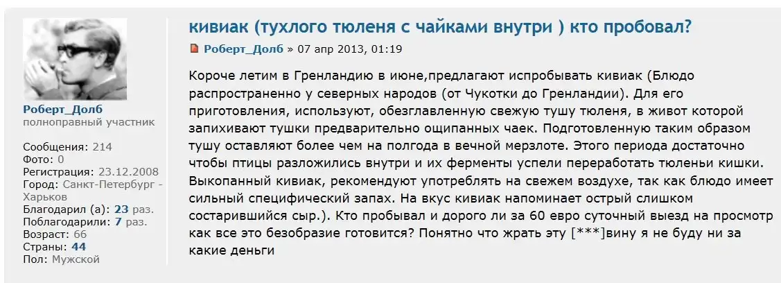 Кивиак не имеет никакого отношения к киви. Это деликатесное блюдо, распространено среди народов, проживающих в арктических широтах от Чукотки до Гренландии. Для приготовления кивиака берут обезглавленную тушу тюленя, которого набивают тушами небольших местных птичек из семейства чистиковых ( не потрошёнными). А затем «консервируют» все это дело, замазывая разрезы на шкуре тюленя — салом. После таких подготовительных работ, всю эту «вкусняшку» закапывают в землю и ждут примерно пол года, пока деликатес «приготовится».