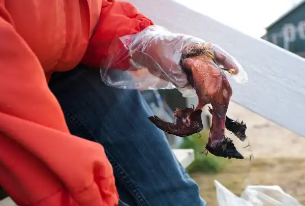 Этого периода достаточно чтобы птицы разложились внутри и их ферменты успели переработать тюленьи кишки.