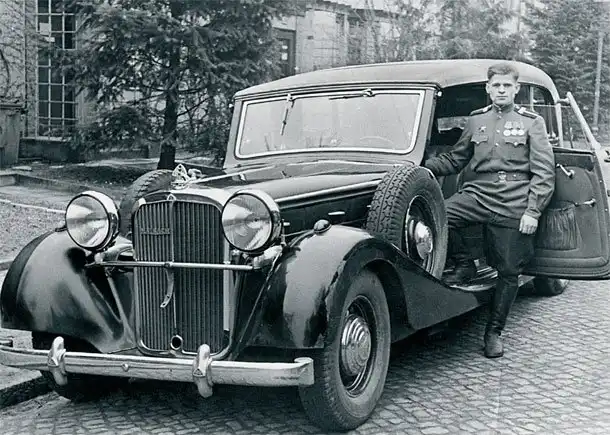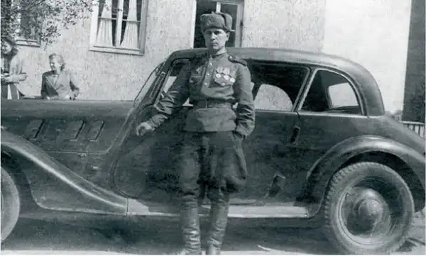 Рядом с грузовиком стояла легковая автомашина марки "оппель-кадет" с открытой дверцей. Около нее в снегу лежал немецкий офицер в шубе с воротником, но в фуражке и целился, как показалось, в меня из пистолета.