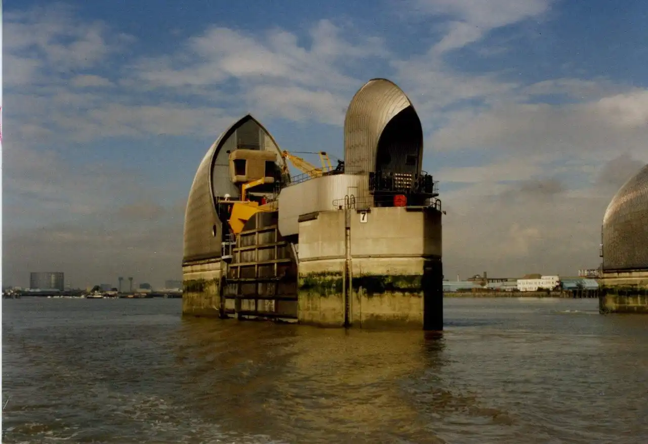 8 мая 1984 года королева Елизавета II официально открыла Барьер Темзы. Он перекрывает реку шириной 520 метров: футуристического вида сверкающие сооружения, каждое высотой с пятиэтажный дом, делят поток на четыре отрезка по 61 метру и два судоходных пролёта по 30 метров. В этих проёмах установлены стальные поворотные сегменты, в обычное время лежащие на дне реки. При необходимости сегменты весом по 3700 тонн синхронно поворачиваются на 90 градусов, надёжно перекрывая течение.