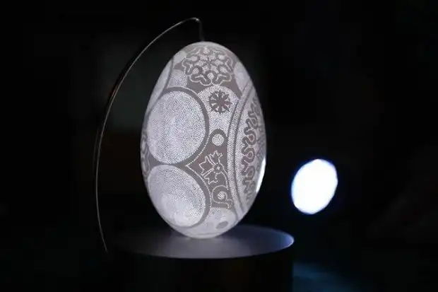 В общей сложности, Франк Гром (Franc Grom) делает в каждом яйце от двух с половиной до семнадцати тысяч крошечных отверстий. Как ни странно, но изначально свой опыт словенец приобретал, работая с слоновой костью. Его серия пасхальных яиц демонстрирует всю хрупкость каркаса яичной скорлупы. Дополнительная подсветка же, заставляет пасхальные яйца по-настоящему светиться. Большая часть работ словенского мастера не продается а экспонируется в различных музеях Европы.