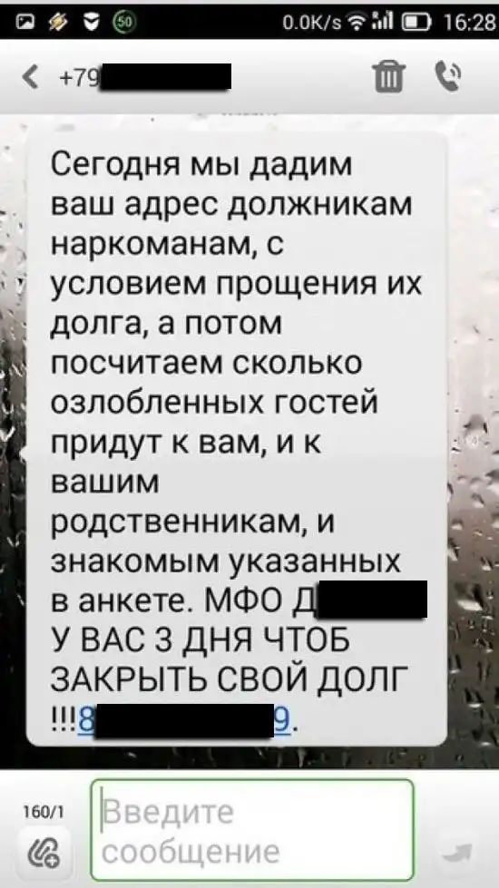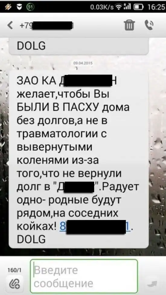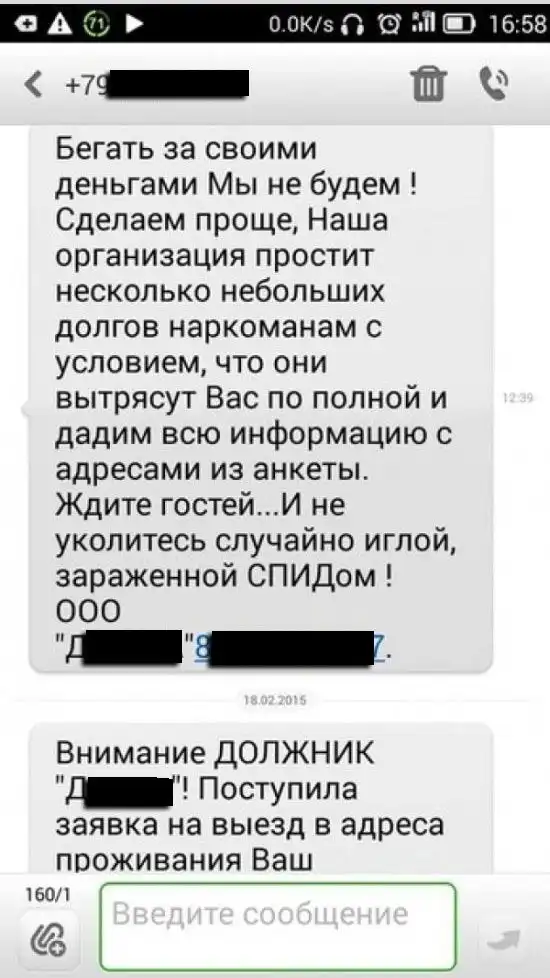 Еще один человек, на сей раз житель Севастополя, воспользовался кредитом одной печально известной компании и очень быстро пожалел о содеянном. Так как проценты там начисляются ежедневно, он уже заплатил 7000 рублей за взятые в долг 5000, однако, потом произошла небольшая задержка, и к делу тут же подключилось не менее известное коллекторское агентство, от которого клиент теперь получает вот такие сообщения. И это лишь наиболее адекватная часть сообщений, пришедших от коллекторов.