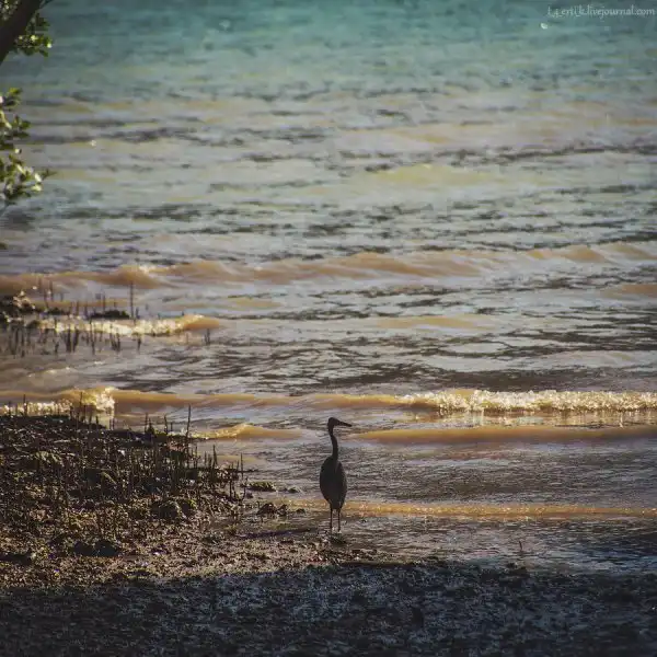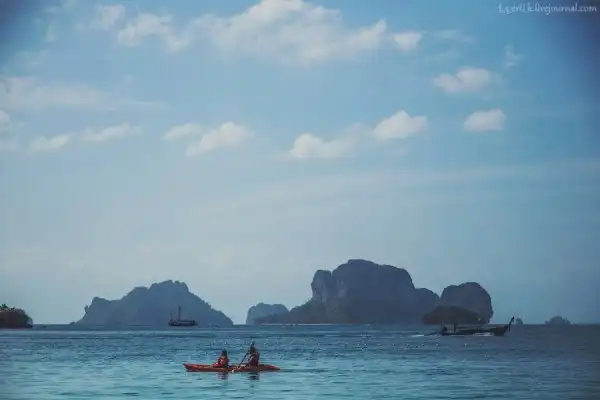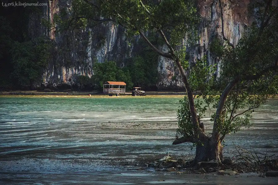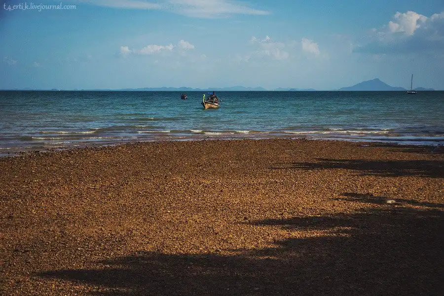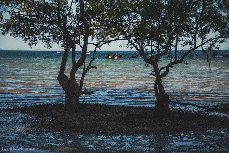 От Краби-тауна до полуострова Рейли минут двадцать на длиннохвостой лодке. Мы причалили к Reiley East в отлив, поэтому нам пришлось метров сто идти по каменистому дну по колено в мутной воде, стараясь не навернуться, — лодка просто не могла подойти ближе к берегу.