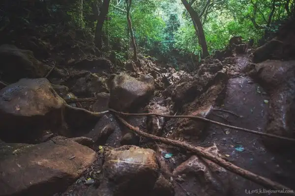 Сначала был подъем, потом спуск, и из жаркого яркого полудня мы попали в прохладные влажные сумерки, притаившиеся в ущелье.