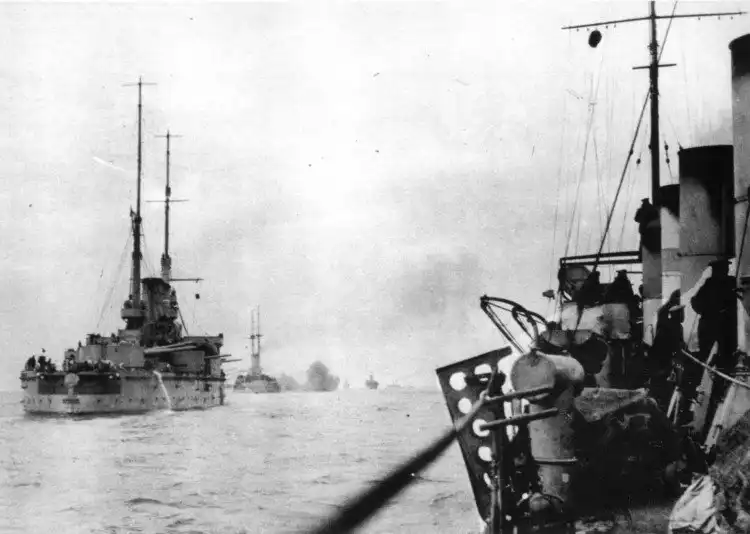 В тягостном ожидании, с трудом сдерживая нетерпеливое желание ввязаться в бой, следили на «Ростиславе» за огнем «Гебена» и за показавшимися с юга кораблями второй полубригады. Вот уже стали ясно различимы головной «Три Святителя» и следовавший за ним «Пантелеймон» с его характерными серповидными катерными кранами на спардеке. На «Ростиславе» сбавили ход, чтобы уступить кораблям место в строю, «Пантелеймон» начал обгонять «Три Святителя», но что это?.. Рев снарядов, пронесшихся почти над «Ростиславом», заставил непроизвольно пригнуться находившихся на его мостике. Это «Пантелеймон», не ожидая момента вступления в строй и не включаясь в централизованную, явно неудачную стрельбу бригады, самостоятельно открыл огонь по показавшемуся из-за корпуса «Ростислава» «Гебену». Уже вторым залпом «Пантелеймон» накрыл немецкий корабль. После попаданий двух 305-мм снарядов, круто повернув, «Гебен» вышел из боя...