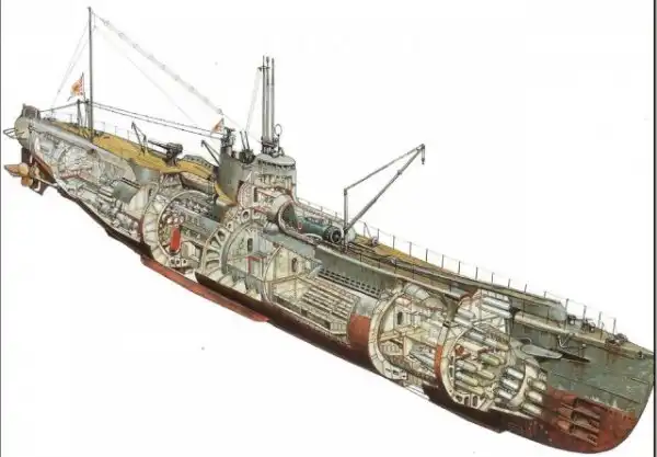 Размещение гидросамолёта E14Y в ангаре подводной лодки.